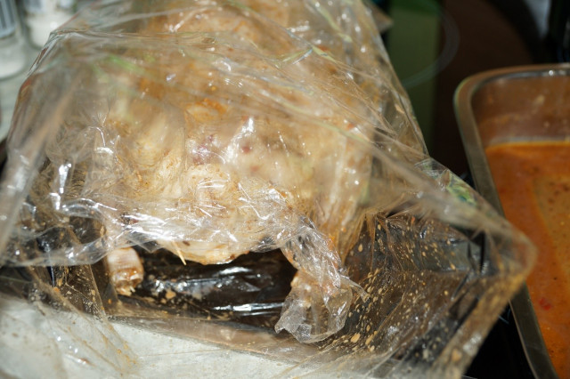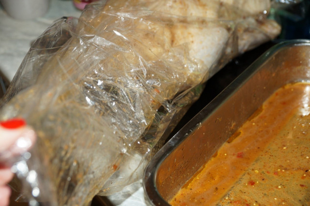 Аккуратно разрезать сверху пленку, раскрыть ее и переложить утку на другой листик стороной, которая была в жидкости.
