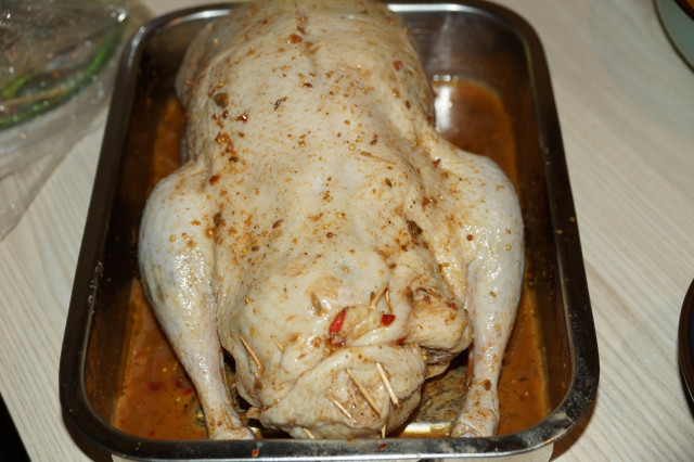 Утку посолить снаружи и внутри, и намазать маринадом снаружи и внутри.