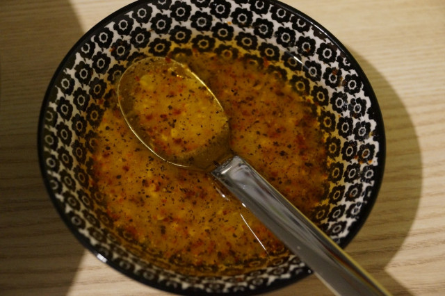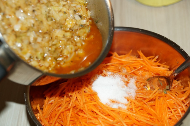 В растительное масло всыпать 1 ст.л. готовой сухой приправы для корейской моркови.