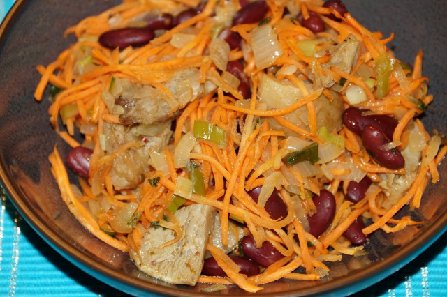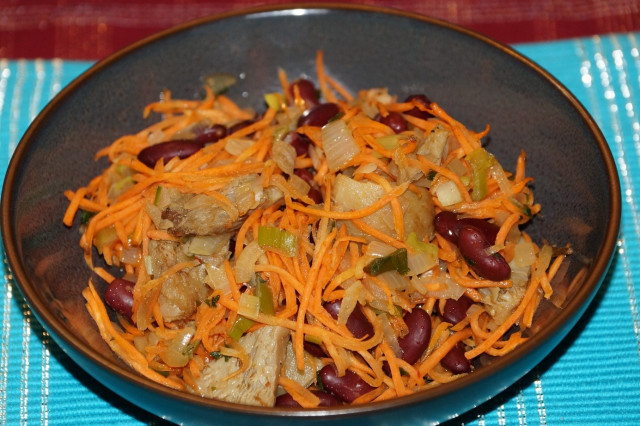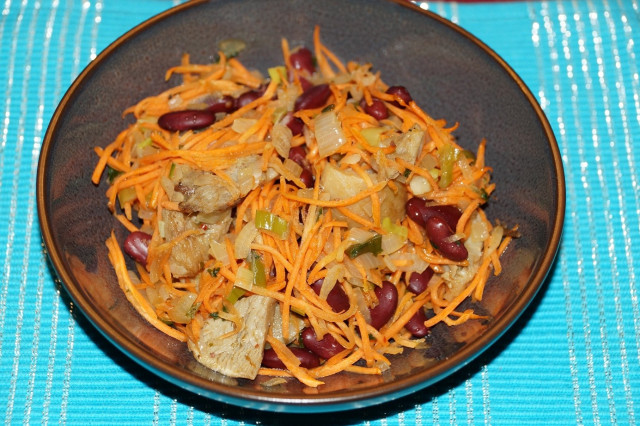 Морковь по – корейски с красной фасолью, зеленым луком, репчатым луком и маринованными груздями.