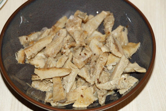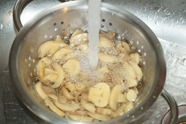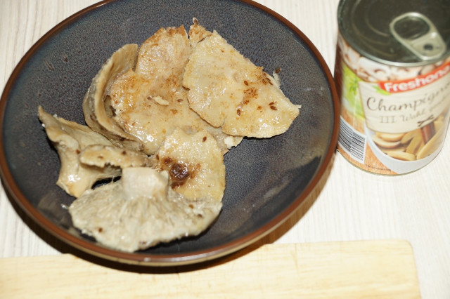 Консервированные шампиньоны откинуть на дуршлаг и хорошо промыть под водой. Дать воде стечь.