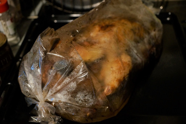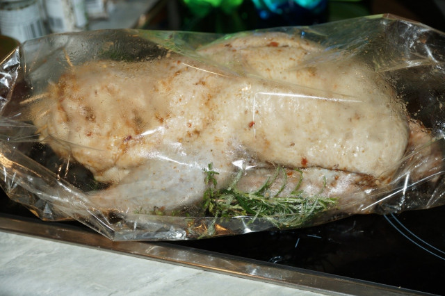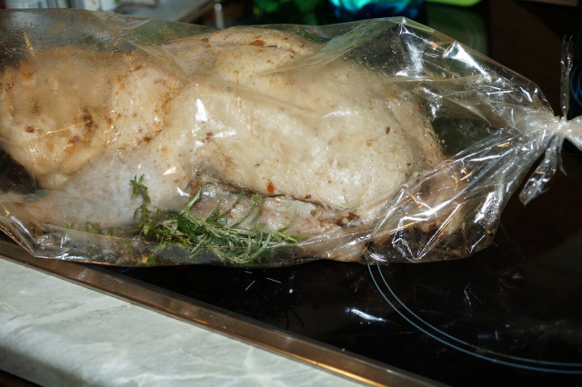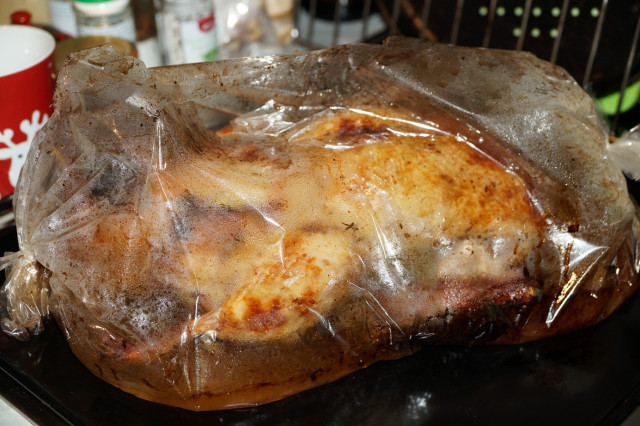 А когда положите утку в рукав для запекания – не нужно добавлять ни воду (как стоит по инструкции), ни оставшийся соус. Той жидкости, которая на утке уже достаточно.