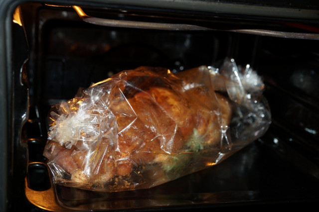 Накрыть утку пленкой и аккуратно вложить в подготовленный рукав для запекания брюшком вниз.