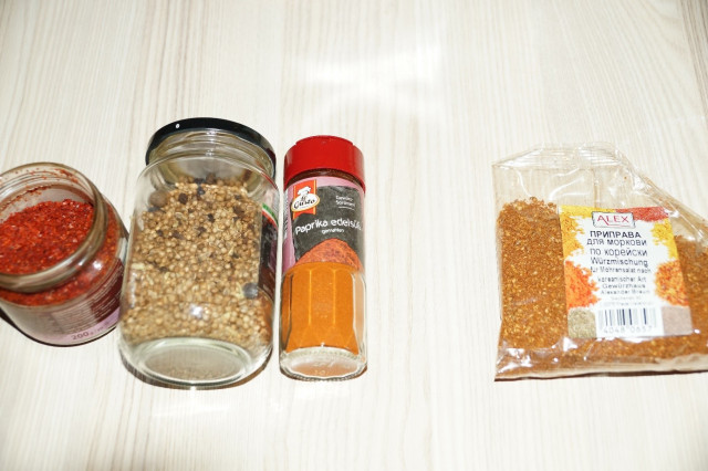 Если у вас нет готовой приправы для корейской моркови, то можно смешать 1 ч.л. сухого красного перца паприки (не острого), 1/3 ч.л. красного перца средней жгучести (хлопьями) и 1 ч.л. молотого кориандра – все измельчить в ступке или молотком в полиэтиленовом мешке.