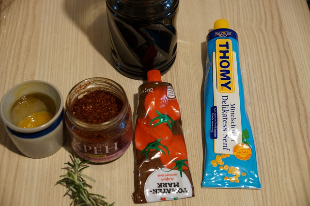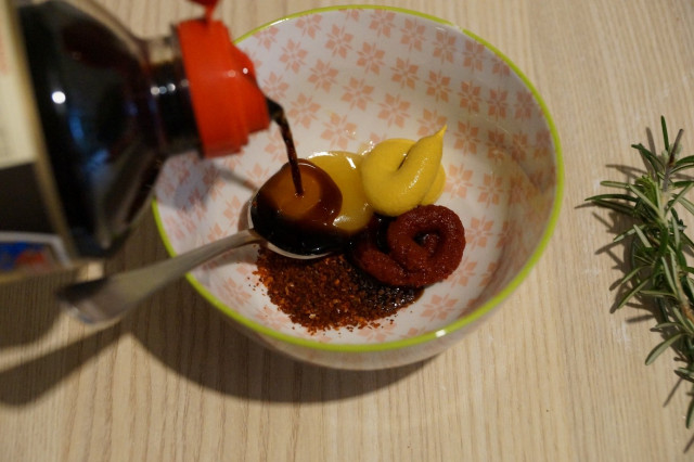 В чашке смешать томатную пасту, соевый соус, красный перец, горчицу, приправу для шашлыка, немного соли и мед.