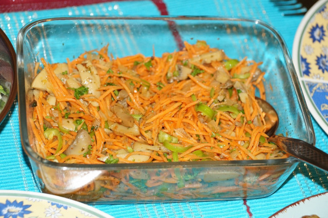 Морковь по – корейски с консервированными грибами, зеленым полуострым перцем, зеленым луком, репчатым луком и петрушкой.
