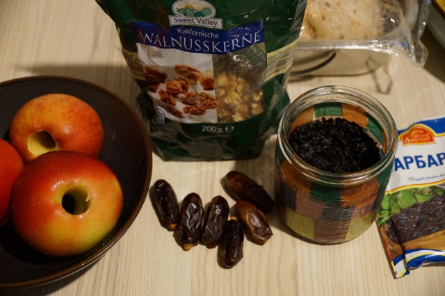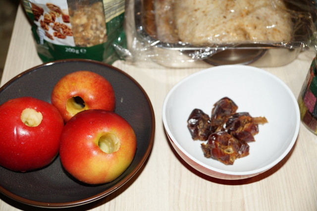 Каждое яблоко нафаршировать. Сначала – финик, затем орех, потом барбарис, орех и закрыть фиником.