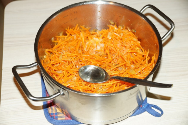 Ещё раз все перемешать, если нужно посолить. Пробовать на соль нужно не морковь, а жидкость.