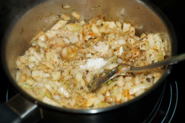 Все посолить, поперчить и потушить 3 – 5 минут до стеклянного цвета лука.
