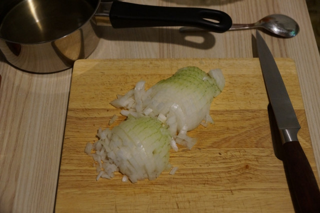 Очистить 1 среднюю луковицу и порезать мелкими кубиками, положить в сотейник.